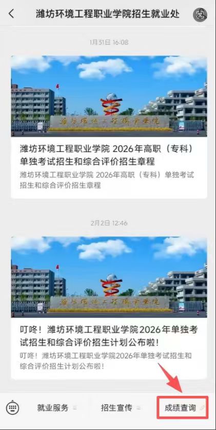 (2)考生关注“潍坊环境工程职业学院招生就业处”微信公众号,在对话框栏目里面找到“成绩查询”菜单,点击进入,输入对应信息查询即可。