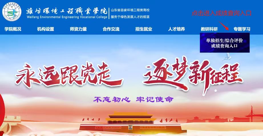 (1)登录潍坊环境工程职业学院官网,点击首页“单独招生/综合评价成绩查询入口”漂浮窗口,点击进入,输入对应信息查询即可。