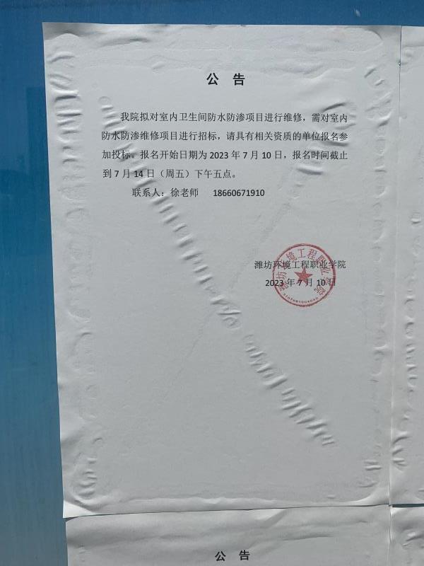 潍坊环境工程职业学院2023年室内防水防渗维修项目招标公告