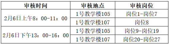 1.进入资格审查范围的考生按时到指定地点进行资格审查,未按上述规定时间进行资格审查的,视为自动放弃。如资格审查与网上初审结果不一致,以资格审查结果为准。为方便工作,请放弃面试资格审查的考生于2月5日17:00前以短信形式发送“姓名+身份证号+岗位+放弃面试资格审查”至17862072309。